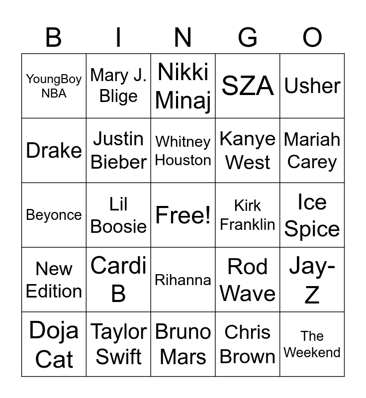 This bingo card has a free space and 24 words: Cardi B, Taylor Swift, Whitney Houston, Doja Cat, Usher, YoungBoy NBA, Drake, Mary J. Blige, Kirk Franklin, Rihanna, Kanye West, Beyonce, Rod Wave, Jay-Z, Justin Bieber, Chris Brown, Ice Spice, Nikki Minaj, Mariah Carey, Lil Boosie, The Weekend, New Edition, SZA and Bruno Mars.