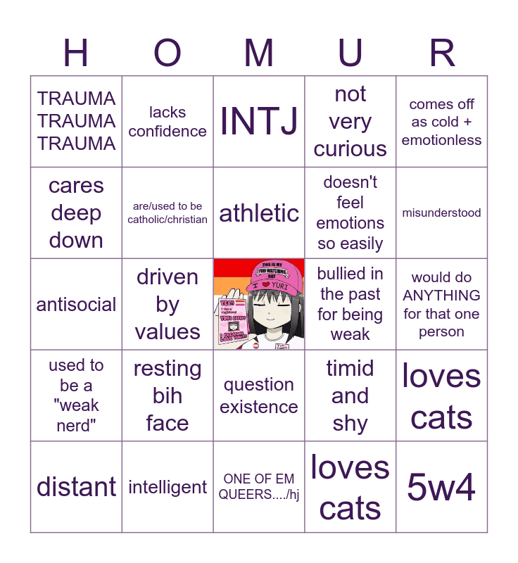 This bingo card has a free space and 24 words: resting bih face, intelligent, athletic, distant, comes off as cold + emotionless, TRAUMA TRAUMA TRAUMA, cares deep down, lacks confidence, bullied in the past for being weak, question existence, doesn't feel emotions so easily, antisocial, timid and shy, loves cats, are/used to be catholic/christian, loves cats, would do ANYTHING for that one person, INTJ, misunderstood, driven by values, 5w4, used to be a "weak nerd", not very curious and ONE OF EM QUEERS..../hj.