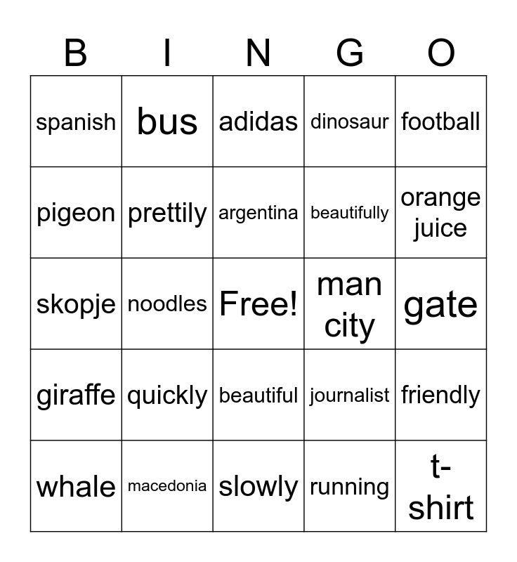 This bingo card has a free space and 24 words: quickly, macedonia, argentina, whale, football, spanish, pigeon, bus, man city, beautiful, beautifully, skopje, journalist, friendly, prettily, running, gate, adidas, orange juice, noodles, t-shirt, giraffe, dinosaur and slowly.