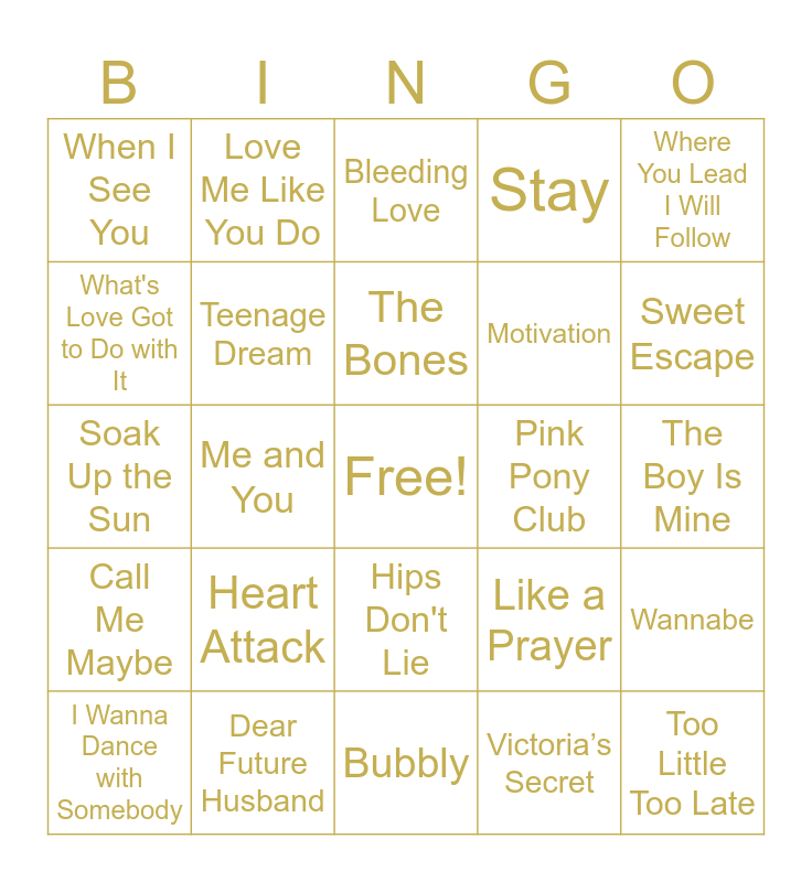 This bingo card has a free space and 35 words: Levitating, The Man, get him back!, Teenage Dream, Hips Don't Lie, Stay, What's Love Got to Do with It, Can’t Get You Out of My Head, The Bones, Royals, Soak Up the Sun, Where You Lead I Will Follow, Dog Days Are Over, Starships, When I See You, Pink Pony Club, Victoria’s Secret, Me and You, Call Me Maybe, Too Little Too Late, Like a Prayer, I Wanna Dance with Somebody, Wannabe, Dear Future Husband, Bleeding Love, Sweet Escape, I Feel Like A Woman, Love on Top, Motivation, The Boy Is Mine, Come Clean, Bubbly, Heart Attack, Love Me Like You Do and Candy.