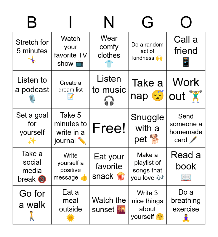 This bingo card has a free space and 24 words: Write yourself a positive message πŸ‘, Eat a meal outside 🌞, Listen to music 🎧, Go for a walk 🚢, Call a friend πŸ“±, Stretch for 5 minutes πŸ€Έβ€β™€οΈ, Listen to a podcast πŸŽ™οΈ, Watch your favorite TV show πŸ“Ί, Snuggle with a pet πŸ•, Eat your favorite snack 🍿, Take a nap 😴, Set a goal for yourself ✨, Make a playlist of songs that you love 🎢, Read a book πŸ“–, Create a dream list πŸ“, Write 3 nice things about yourself πŸ€—, Send someone a homemade card πŸ–‹οΈ, Wear comfy clothes πŸ‘•, Work out πŸ‹οΈβ€β™‚οΈ, Take 5 minutes to write in a journal ✏️, Do a breathing exercise πŸ§˜β€β™€οΈ, Take a social media break πŸ“΅, Do a random act of kindness πŸ™Œ and Watch the sunset πŸŒ‡.