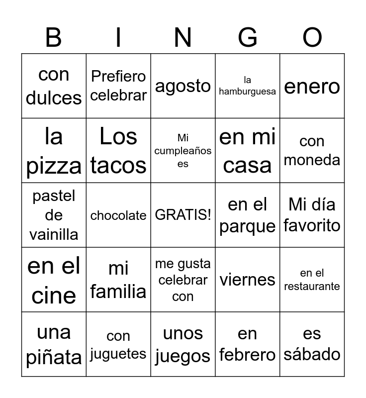 This bingo card has a free space and 24 words: mi familia, con juguetes, Mi cumpleaños es, una piñata, enero, con dulces, la pizza, Prefiero celebrar, en el parque, me gusta celebrar con, en mi casa, pastel de vainilla, viernes, en el restaurante, Los tacos, en febrero, Mi día favorito, agosto, con moneda, chocolate, es sábado, en el cine, la hamburguesa and unos juegos.