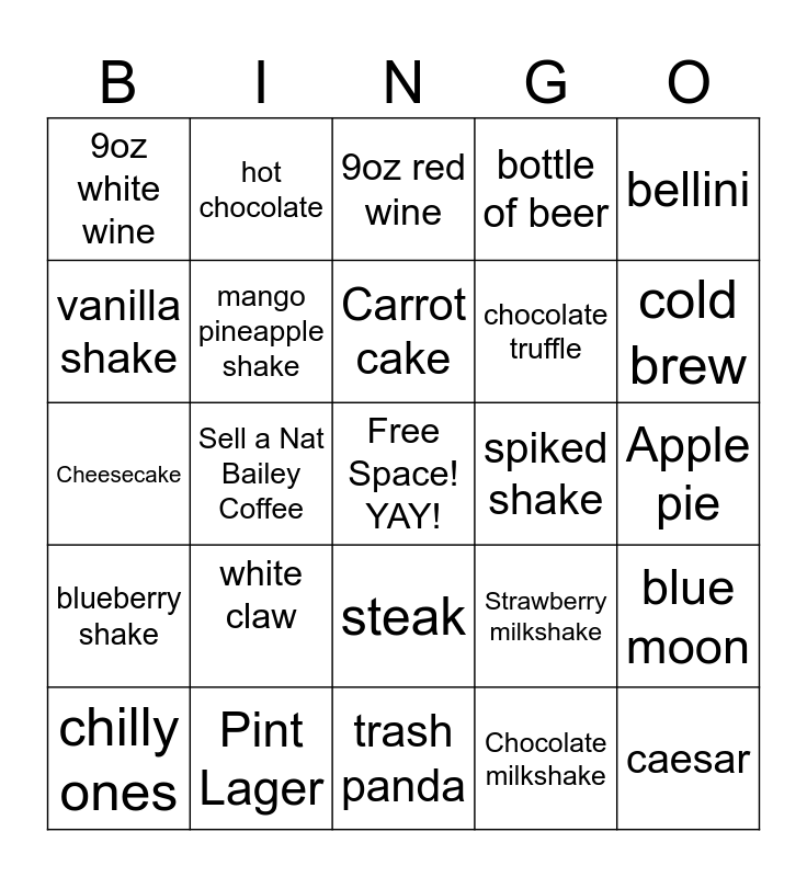 This bingo card has a free space and 24 words: white claw, Pint Lager, Carrot cake, chilly ones, bellini, 9oz white wine, vanilla shake, hot chocolate, spiked shake, steak, chocolate truffle, Cheesecake, Strawberry milkshake, blue moon, mango pineapple shake, Chocolate milkshake, Apple pie, 9oz red wine, cold brew, Sell a Nat Bailey Coffee, caesar, blueberry shake, bottle of beer and trash panda.