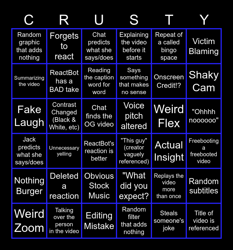 This bingo card has 53 words: No onscreen credit, Fake Laugh, Badly Cropped, Freebooting a freebooted video, Weird Flex, Steals someone's joke, Forgets to react, Random Tangent, Victim Blaming, Title of video is referenced, Summarizing the video, Editing Mistake, Unnecessary yelling, Jack predicts what she says/does, Video does not match title, ReactBot's reaction is better, ReactBot has a BAD take, Contrast Changed (Black & White, etc), Credit the creators!(Free Space), Repeat of a called bingo space, Shaky Cam, Nothing Burger, Reading the caption word for word, Random graphic that adds nothing, *Spacebar*, "This guy" (creator vaguely referenced), Replays the video more than once, ...that was it?, "What did you expect?, Says something that makes no sense, Stock Sound Effect, Talking over the person in the video, "What did you think was gonna happen?", "bro...", Random filter that adds nothing, Random subtitles, Explaining the video before it starts, Actual Insight, Chat predicts what she says/does, Repeating what someone says but louder, References famous audio/video, Jack's prediction is too thunk, Chat finds the OG video, Any rhyming words ("crusty musty" etc.), Baby talk, "Ohhhh noooooo", Obvious Stock Music, Weird Zoom, Onscreen Credit!?, Voice pitch altered, Uses same creator's vids multiple times, Deleted a reaction and Reaction worse than prediction.