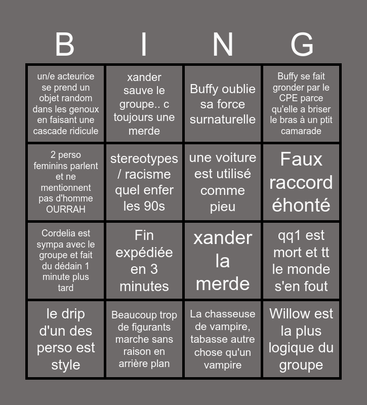 This bingo card has 19 words: xander la merde, difference d'age entre les romances alerte, Buffy oublie sa force surnaturelle, Willow est la plus logique du groupe, qq1 est mort et tt le monde s'en fout, 2 perso feminins parlent et ne mentionnent pas d'homme OURRAH, La chasseuse de vampire, tabasse autre chose qu'un vampire, un/e acteurice se prend un objet random dans les genoux en faisant une cascade ridicule, xander sauve le groupe.. c toujours une merde, Cordelia est sympa avec le groupe et fait du dédain 1 minute plus tard, Fin expédiée en 3 minutes, stereotypes / racisme quel enfer les 90s, une voiture est utilisé comme pieu, Beaucoup trop de figurants marche sans raison en arrière plan, le drip d'un des perso est style, GRS, Buffy se fait gronder par le CPE parce qu'elle a briser le bras à un ptit camarade, Faux raccord éhonté and Bruit de lion pour un vampire.
