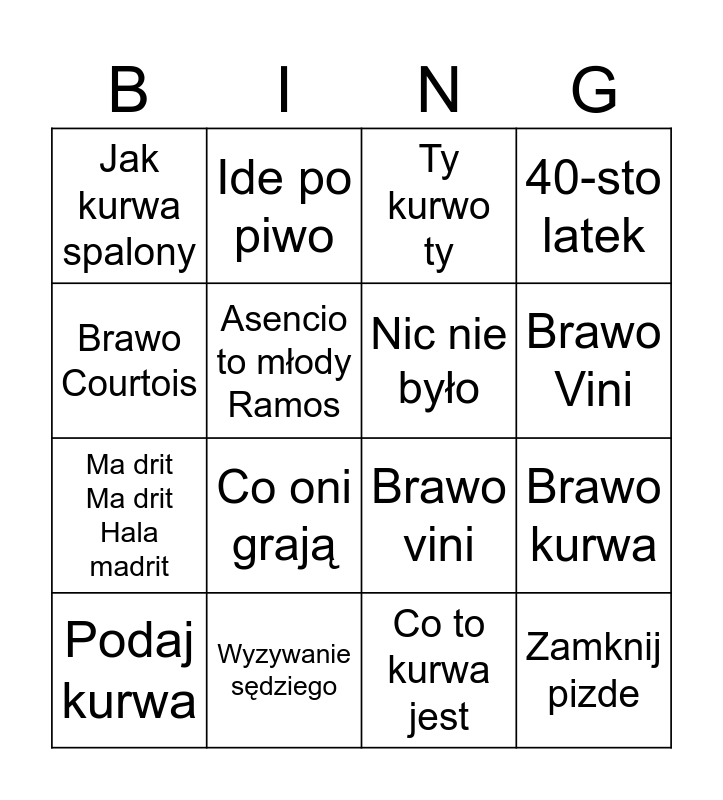 This bingo card has 22 words: Wyzywanie sędziego, Kylianek mój, Ide po piwo, Zajeb kurwa, Asencio to młody Ramos, Nic nie było, Jak kurwa spalony, Ty kurwo ty, Brawo vini, Zamknij pizde, Ma drit Ma drit Hala madrit, 40-sto latek, Piwo mi sie skończyło, Co za cwel murzyński, Co to kurwa jest, Boli was wielki real, Brawo kurwa, Podaj kurwa, Co oni grają, Brawo Courtois, Brawo Vini and Ładnie zajebał.