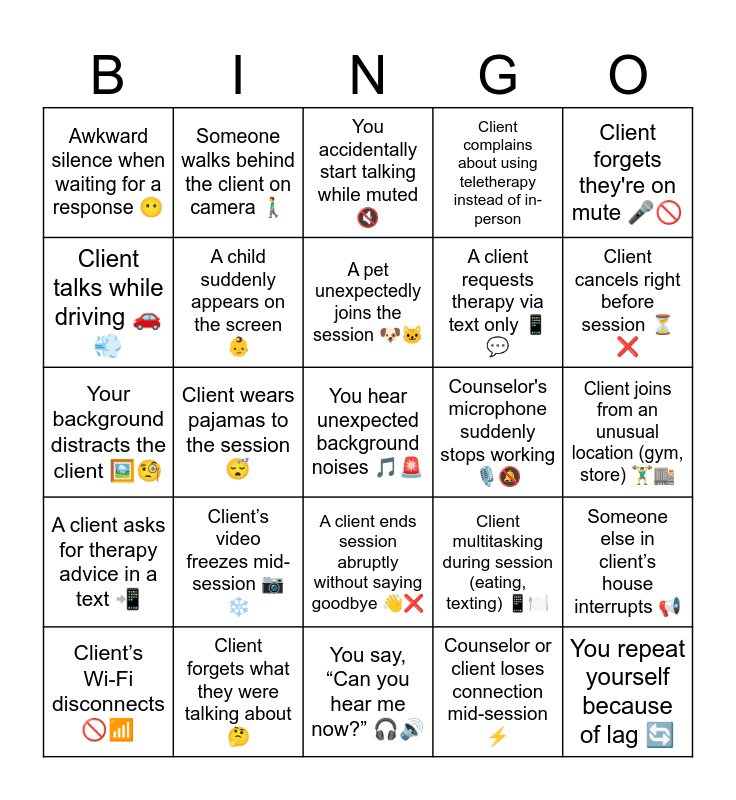 This bingo card has 25 words: Clientβs video freezes mid-session π· βοΈ, You say, βCan you hear me now?β π§π, A pet unexpectedly joins the session πΆπ±, Clientβs Wi-Fi disconnects π«πΆ, Client forgets they're on mute π€π«, Awkward silence when waiting for a response πΆ, Client talks while driving ππ¨, Someone walks behind the client on camera πΆββοΈ, Counselor's microphone suddenly stops working ποΈπ, A client ends session abruptly without saying goodbye πβ, A client requests therapy via text only π±π¬, Your background distracts the client πΌοΈπ§, Client multitasking during session (eating, texting) π±π½οΈ, Someone else in clientβs house interrupts π’, A child suddenly appears on the screen πΆ, You repeat yourself because of lag π, Client joins from an unusual location (gym, store) ποΈββοΈπ¬, You accidentally start talking while muted π, Client cancels right before session β³β, Client wears pajamas to the session π΄, You hear unexpected background noises π΅π¨, Client forgets what they were talking about π€, A client asks for therapy advice in a text π², Client complains about using teletherapy instead of in-person and Counselor or client loses connection mid-session β‘.