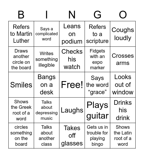 This bingo card has a free space and 29 words: circles something on the board, Calls on Emma, Bangs on a desk, makes a joke, Refers to Martin Luther, Leans on podium, Writes something illegible, Talks about depressing music, Says the word “grace”, Talks about another class, Looks out of window, Shows the Latin root of a word, Takes off glasses, Gets us in trouble for playing bingo, Crosses arms, Refers to Augustine, Laughs, Shows the Greek root of a word, Coughs loudly, Smiles, Plays guitar, Gives an analogy, Fidgets with an expo marker, Draws another circle on the board, Refers to a scripture, Says a complicated word, Drinks his drink, Checks his watch and Calls us “guys”.