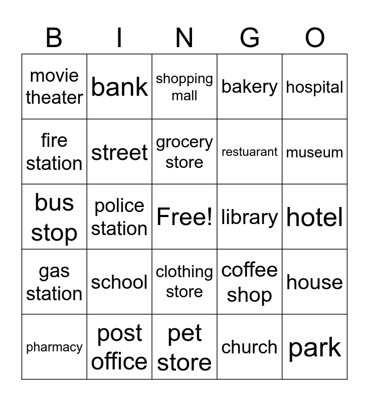 This bingo card has a free space and 24 words: school, post office, grocery store, pharmacy, hospital, movie theater, fire station, bank, library, clothing store, restuarant, bus stop, coffee shop, house, street, church, hotel, shopping mall, museum, police station, park, gas station, bakery and pet store.
