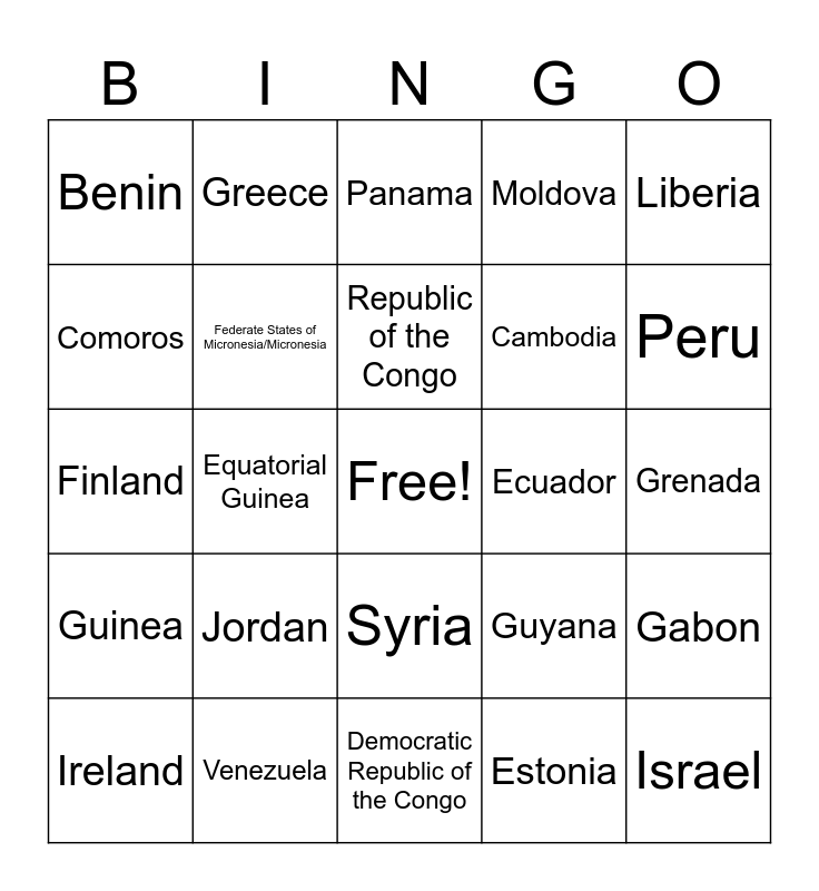 This bingo card has a free space and 34 words: Djibouti, São Tomé and Príncipe, Monaco, Botswana, Grenada, Comoros, Federate States of Micronesia/Micronesia, Democratic Republic of the Congo, Cambodia, Israel, Finland, Greece, Estonia, Nepal, Guinea, Equatorial Guinea, Syria, Ecuador, Gabon, Ireland, Venezuela, Antigua and Barbuda, Moldova, Peru, Albania, Jordan, Panama, Germany, Liberia, Benin, Malaysia, Republic of the Congo, Guyana and Seychelles.