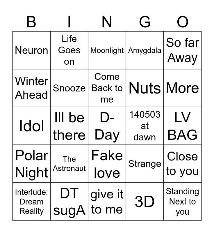 This bingo card has a free space and 24 words: Interlude: Dream Reality, The Astronaut, Come Back to me, 3D, So far Away, Neuron, Life Goes on, Moonlight, 140503 at dawn, LV BAG, Idol, Snooze, Strange, Close to you, Winter Ahead, DT sugA, give it to me, Amygdala, More, Polar Night, Ill be there, Fake love, Nuts and Standing Next to you.