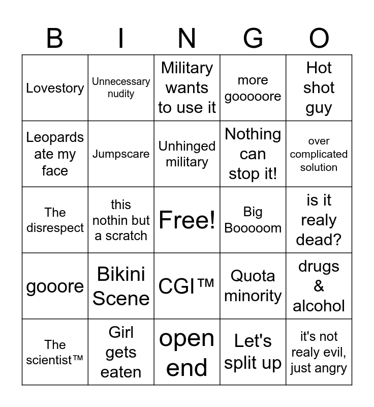 This bingo card has a free space and 24 words: Bikini Scene, Girl gets eaten, Unhinged military, The scientist™, Hot shot guy, Lovestory, Leopards ate my face, Unnecessary nudity, Big Booooom, CGI™, Nothing can stop it!, The disrespect, Quota minority, drugs & alcohol, Jumpscare, Let's split up, is it realy dead?, Military wants to use it, over complicated solution, this nothin but a scratch, it's not realy evil, just angry, gooore, more gooooore and open end.
