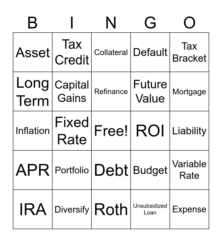 This bingo card has a free space and 34 words: Subsidized Loan, Unsubsidized Loan, Interest, 720, APR, Capital Gains, Tax Bracket, IRA, Tax Credit, Taxable Income, Refinance, Collateral, Financial Literacy, Depreciation, ROI, Mortgage, Diversify, Inflation, Portfolio, Budget, Debt, Income, Asset, Liability, Roth, Expense, Default, Principal, Future Value, Long Term, Short Term, Fixed Rate, Variable Rate and Surplus.