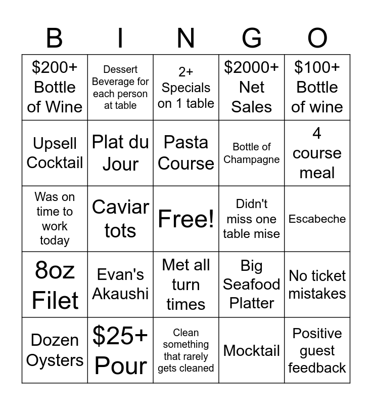 This bingo card has a free space and 24 words: Evan's Akaushi, $25+ Pour, Pasta Course, Dozen Oysters, $100+ Bottle of wine, $200+ Bottle of Wine, Upsell Cocktail, Dessert Beverage for each person at table, Didn't miss one table mise, Met all turn times, Bottle of Champagne, Was on time to work today, Big Seafood Platter, No ticket mistakes, Plat du Jour, Mocktail, Escabeche, 2+ Specials on 1 table, 4 course meal, Caviar tots, Positive guest feedback, 8oz Filet, $2000+ Net Sales and Clean something that rarely gets cleaned.