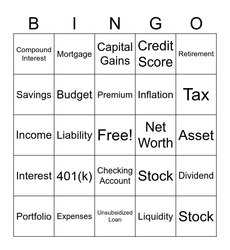 This bingo card has a free space and 27 words: Stock, Refinance, Inflation, Unsubsidized Loan, Savings, Capital Gains, Mortgage, Interest, Net Worth, Dividend, Income, Credit Score, Portfolio, Expenses, Tax, FREE SPACE, Budget, Premium, 401(k), Compound Interest, Asset, Liquidity, Liability, Stock, Checking Account, Retirement and Diversification.