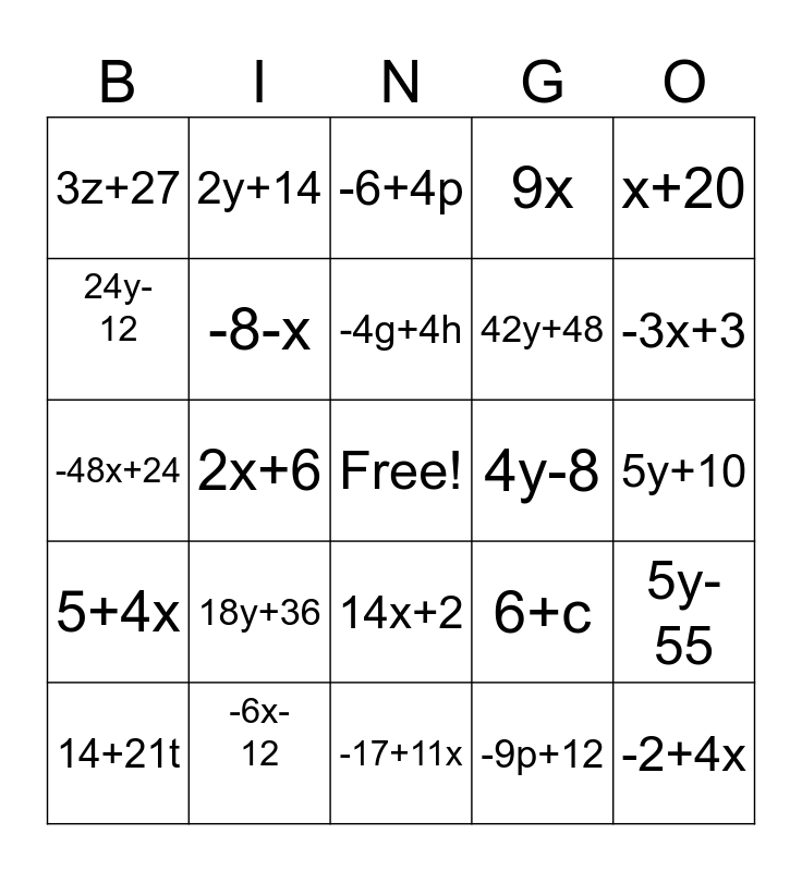 This bingo card has a free space and 47 words: 2x+8, -2+4x, 17x-17y, -17+11x, 18y+36, -15+25y, 2y+14, 9x-18, 24y-12, 7x+1, -8-x, 9x, 5y-55, 6+c, 2b+4y, 3x+2, -4g+4h, 4y-8, -4y, x+20, 2x+6, -9p+12, 3z+27, 42y+48, 6x-24, -3x+3, 14+21t, 6-6x, 14x+2, 5+4x, -12+12x, 4x+12, ab+ac, 3x+45, 4y-12, -6x-12, 5y+10, 8+18w, 16d+20, 6v+-16, -10+14j, -6+4p, -48x+24, -72+54y, -9n+36, 10x+-8 and 6y-9.