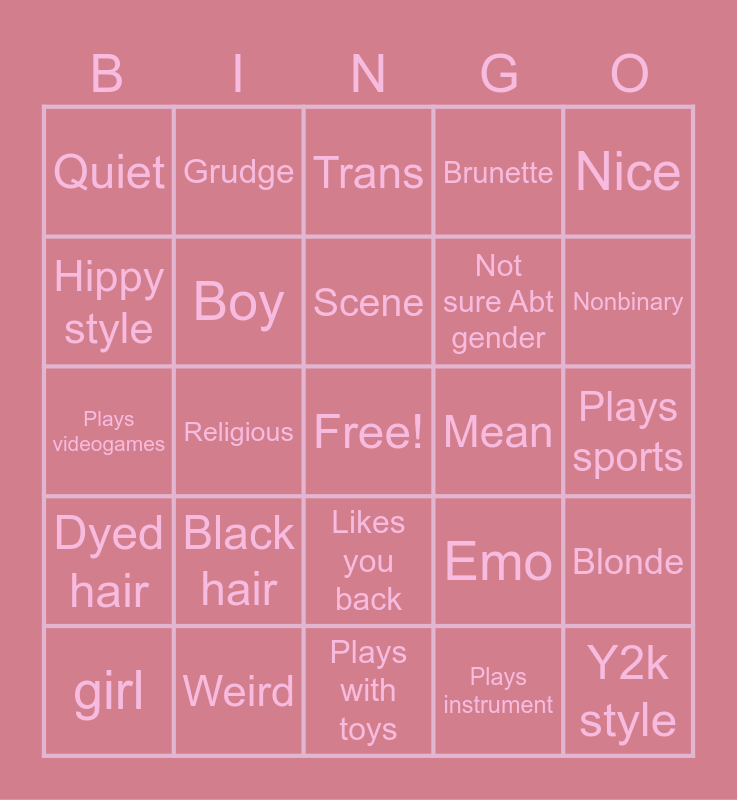 This bingo card has a free space and 24 words: girl, Black hair, Scene, Plays instrument, Nice, Quiet, Grudge, Trans, Mean, Plays sports, Plays videogames, Boy, Emo, Blonde, Hippy style, Weird, Plays with toys, Brunette, Nonbinary, Dyed hair, Religious, Likes you back, Not sure Abt gender and Y2k style.