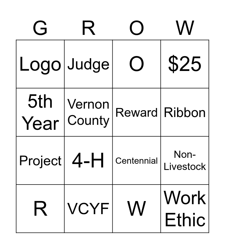 This bingo card has 36 words: Free!, GROW, Goal, Reward, Opportunity, Work Ethic, Ribbon, Thank You, 5th Year, $, Non- Livestock, $25, Diner Dollars, VCYF, 4-H, Logo, Smile, G, R, O, W, Clover, 2025, Alumni, Heart, Judge, Centennial, Gift Card, Project, Vernon County, Drink Dollar, Win-Win-Win, Sponsor, Local Business, Enter & Complete and Hard Work.