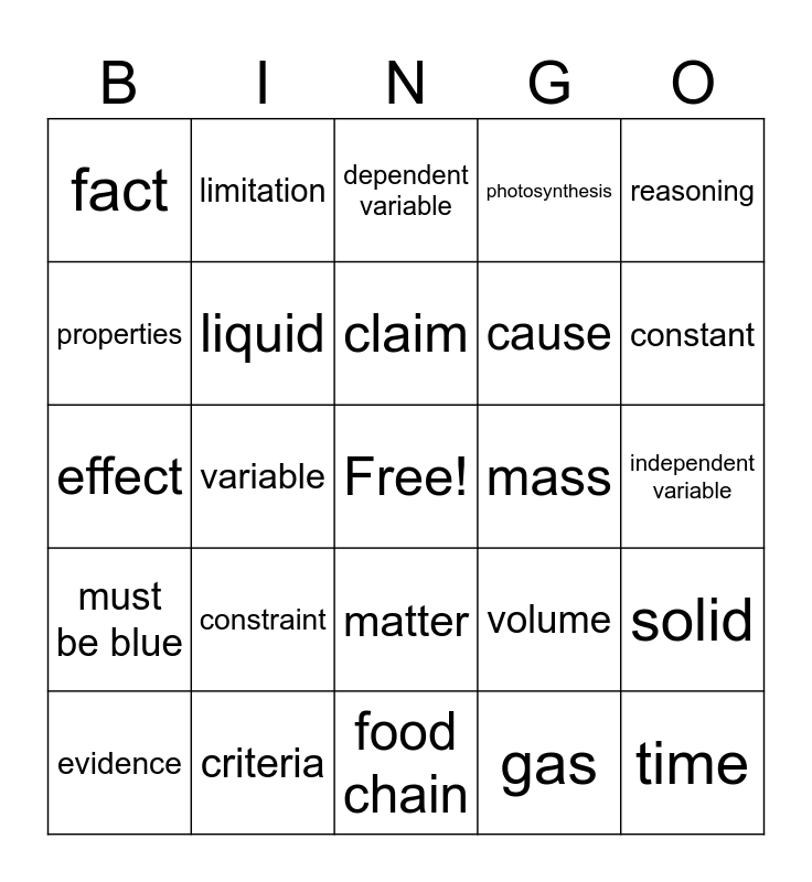 This bingo card has a free space and 24 words: constraint, criteria, claim, evidence, reasoning, fact, properties, limitation, mass, matter, cause, effect, volume, solid, liquid, gas, independent variable, dependent variable, constant, variable, time, must be blue, photosynthesis and food chain.