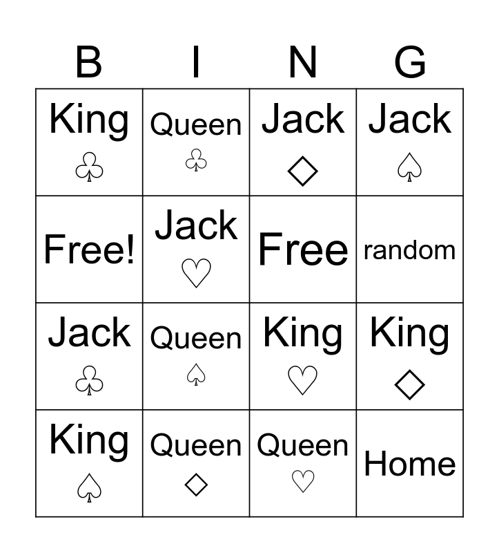 This bingo card has 16 words: Queen ◇, King ◇, Jack ◇, King ♧, Jack ♧, Queen ♧, King ♡, Queen ♡, Free!, Jack ♡, King ♤, Jack ♤, Queen ♤, random, Free and Home.