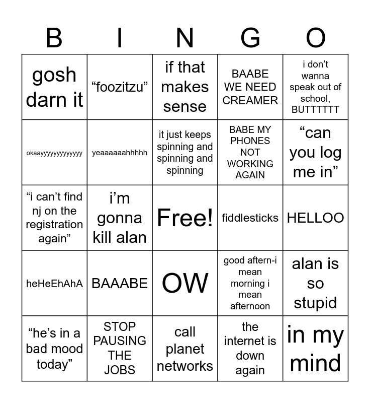 This bingo card has a free space and 24 words: BAAABE, STOP PAUSING THE JOBS, it just keeps spinning and spinning and spinning, “he’s in a bad mood today”, i don’t wanna speak out of school, BUTTTTTT, gosh darn it, okaayyyyyyyyyyyyy, “foozitzu”, fiddlesticks, OW, BABE MY PHONES NOT WORKING AGAIN, “i can’t find nj on the registration again”, good aftern-i mean morning i mean afternoon, alan is so stupid, yeaaaaaahhhhh, the internet is down again, HELLOO, if that makes sense, “can you log me in”, i’m gonna kill alan, in my mind, heHeEhAhA, BAABE WE NEED CREAMER and call planet networks.