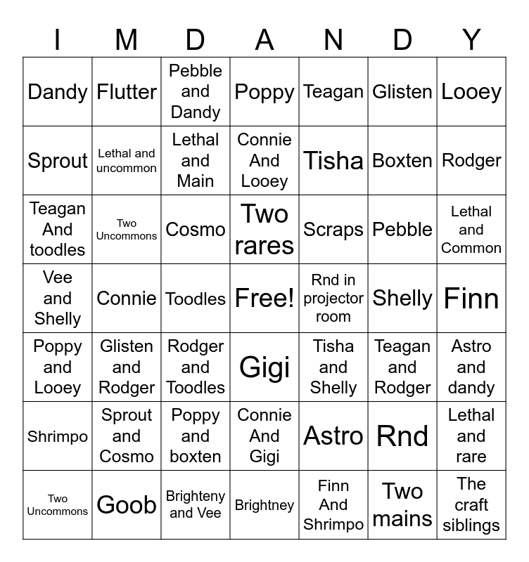 This bingo card has a free space and 48 words: Astro, Boxten, Brightney, Connie, Cosmo, Finn, Flutter, Goob, Glisten, Gigi, Looey, Poppy, Pebble, Scraps, Shrimpo, Shelly, Sprout, Rodger, Rnd, Teagan, Tisha, Toodles, Dandy, Lethal and uncommon, Lethal and rare, Lethal and Main, Lethal and Common, Two Uncommons, Two rares, Two Uncommons, Two mains, Rnd in projector room, Astro and dandy, Sprout and Cosmo, Vee and Shelly, Tisha and Shelly, Teagan and Rodger, Teagan And toodles, Rodger and Toodles, Poppy and boxten, Poppy and Looey, The craft siblings, Pebble and Dandy, Brighteny and Vee, Connie And Looey, Connie And Gigi, Glisten and Rodger and Finn And Shrimpo.