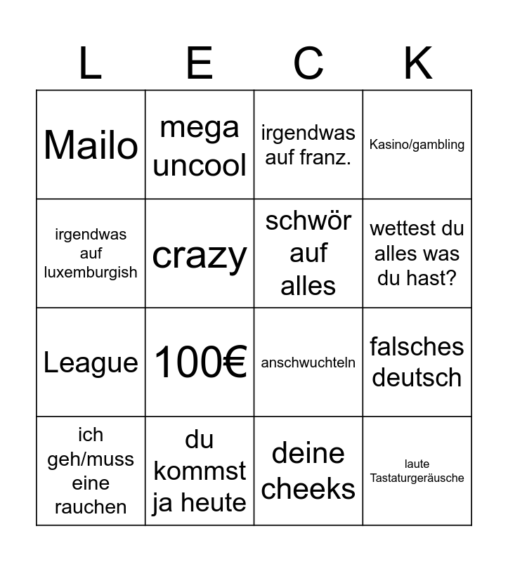 This bingo card has 16 words: du kommst ja heute, falsches deutsch, irgendwas auf franz., Mailo, League, mega uncool, anschwuchteln, deine cheeks, irgendwas auf luxemburgish, crazy, ich geh/muss eine rauchen, Kasino/gambling, 100€, wettest du alles was du hast?, schwör auf alles and laute Tastaturgeräusche.