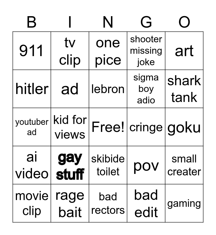 This bingo card has a free space and 24 words: gay stuff, rage bait, lebron, movie clip, art, 911, hitler, tv clip, cringe, skibide toilet, sigma boy adio, youtuber ad, pov, small creater, ad, bad edit, goku, one pice, shark tank, kid for views, gaming, ai video, shooter missing joke and bad rectors.