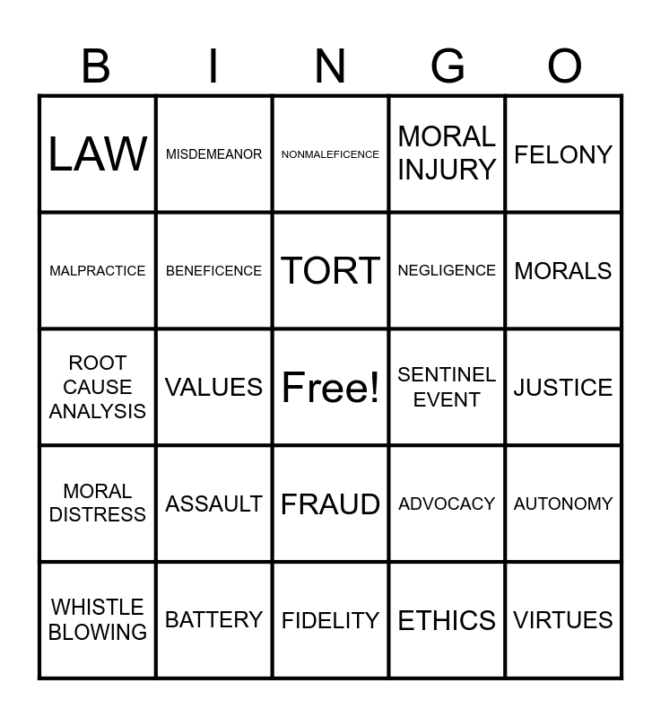 This bingo card has a free space and 24 words: ASSAULT, BATTERY, TORT, WHISTLE BLOWING, FELONY, LAW, MALPRACTICE, MISDEMEANOR, SENTINEL EVENT, FRAUD, NEGLIGENCE, ROOT CAUSE ANALYSIS, ADVOCACY, AUTONOMY, BENEFICENCE, ETHICS, JUSTICE, NONMALEFICENCE, MORALS, VALUES, VIRTUES, MORAL DISTRESS, MORAL INJURY and FIDELITY.