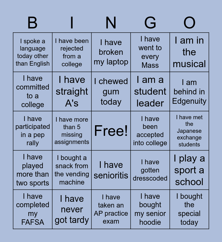 This bingo card has a free space and 24 words: I have completed my FAFSA, I bought a snack from the vending machine, I chewed gum today, I have bought my senior hoodie, I am in the musical, I spoke a language today other than English, I have been rejected from a college, I have broken my laptop, I have been accepted into college, I have met the Japanese exchange students, I have participated in a pep rally, I have straight A's, I have gotten dresscoded, I play a sport a school, I have committed to a college, I have never got tardy, I have taken an AP practice exam, I have went to every Mass, I am behind in Edgenuity, I have played more than two sports, I have more than 5 missing assignments, I have senioritis, I am a student leader and I bought the special today.