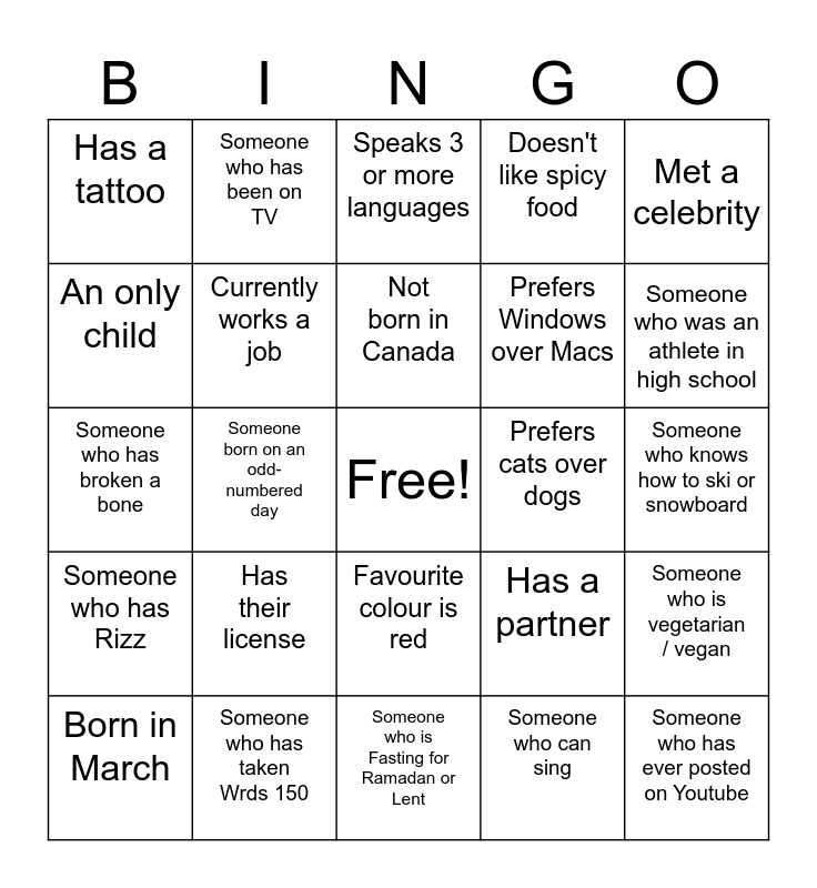 This bingo card has a free space and 24 words: Born in March, Has their license, Not born in Canada, Someone who can sing, Met a celebrity, Has a tattoo, Someone who has been on TV, Speaks 3 or more languages, Prefers cats over dogs, Someone who knows how to ski or snowboard, Someone who has broken a bone, Currently works a job, Has a partner, Someone who is vegetarian / vegan, An only child, Someone who has taken Wrds 150, Someone who is Fasting for Ramadan or Lent, Doesn't like spicy food, Someone who was an athlete in high school, Someone who has Rizz, Someone born on an odd-numbered day, Favourite colour is red, Prefers Windows over Macs and Someone who has ever posted on Youtube.