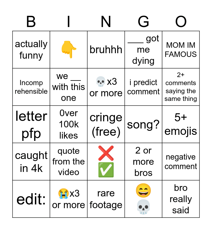 This bingo card has a free space and 24 words: quote from the video, 😭x3 or more, 💀x3 or more, edit:, MOM IM FAMOUS, actually funny, Incomp rehensible, 👇, song?, ❌ ✅, i predict comment, letter pfp, 2 or more bros, negative comment, we __ with this one, 😄 💀, 5+ emojis, bruhhh, 2+ comments saying the same thing, 0ver 100k likes, bro really said, caught in 4k, ___ got me dying and rare footage.