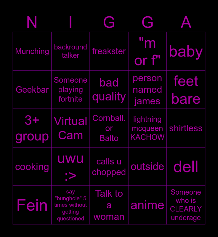 This bingo card has a free space and 29 words: Fein, skipped 5 times in a row, Virtual Cam, echo, Munching, freakster, Someone playing fortnite, uwu :>, lightning mcqueen KACHOW, say "bunghole" 5 times without getting questioned, shirtless, Someone who is CLEARLY underage, Talk to a woman, anime, feet bare, ravens fan, calls u chopped, cooking, baby, 3+ group, outside, Trans, person named james, Geekbar, "m or f", backround talker, dell, bad quality and edit?.