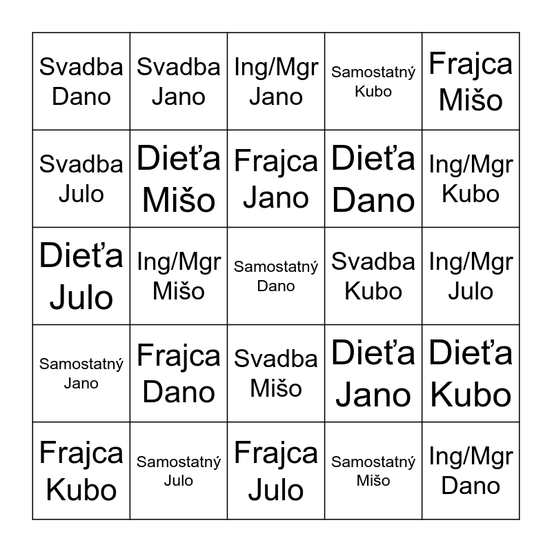 This bingo card has 25 words: Frajca Dano, Frajca Julo, Frajca Jano, Frajca Kubo, Frajca Mišo, Svadba Dano, Svadba Julo, Svadba Jano, Svadba Kubo, Svadba Mišo, Dieťa Dano, Dieťa Julo, Dieťa Jano, Dieťa Kubo, Dieťa Mišo, Ing/Mgr Dano, Ing/Mgr Julo, Ing/Mgr Jano, Ing/Mgr Kubo, Ing/Mgr Mišo, Samostatný Dano, Samostatný Julo, Samostatný Jano, Samostatný Kubo and Samostatný Mišo.