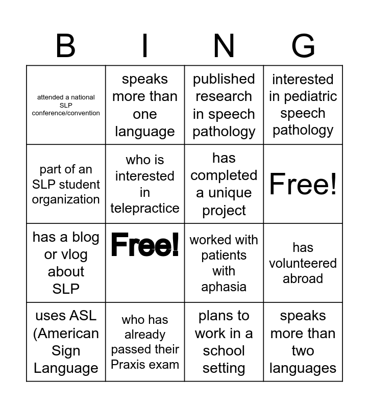 This bingo card has 18 words: Free!, speaks more than two languages, published research in speech pathology, attended a national SLP conference/convention, worked with patients with aphasia, interested in pediatric speech pathology, uses ASL (American Sign Language, speaks more than one language, Free!, has a blog or vlog about SLP, plans to work in a school setting, part of an SLP student organization, has volunteered abroad, who is interested in telepractice, has completed a unique project, plans to specialize in voice disorders, who has already passed their Praxis exam and has a relative also in the healthcare field.