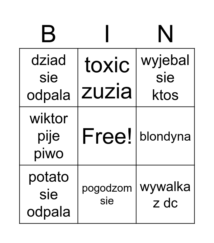 This bingo card has a free space and 8 words: blondyna, wyjebal sie ktos, toxic zuzia, potato sie odpala, dziad sie odpala, wywalka z dc, wiktor pije piwo and pogodzom sie.
