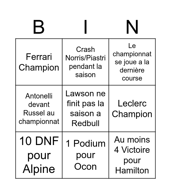 This bingo card has a free space and 8 words: Leclerc Champion, Le championnat se joue a la dernière course, Crash Norris/Piastri pendant la saison, 10 DNF pour Alpine, Ferrari Champion, Au moins 4 Victoire pour Hamilton, Antonelli devant Russel au championnat and 1 Podium pour Ocon.