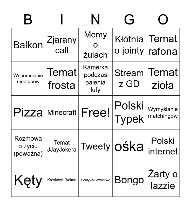 This bingo card has a free space and 24 words: Temat JJayJokera, Kreskówki/Anime, Kamerka podczas palenia lufy, Kęty, Temat rafona, Balkon, Wspomnianie meetupów, Zjarany call, Polski Typek, Tweety, Stream z GD, Pizza, ośka, Polski internet, Temat frosta, Bongo, Wymyślanie matchingów, Memy o żulach, Temat zioła, Minecraft, Żarty o lazzie, Rozmowa o życiu (poważna), Kłótnia o jointy and Polityka/Lewactwo.