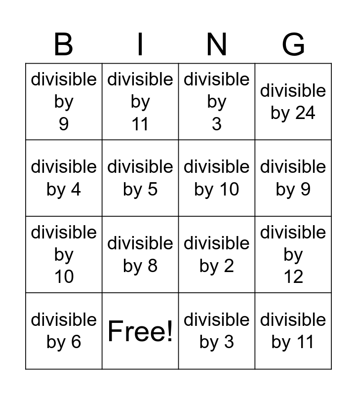 This bingo card has 16 words: Free!, divisible by 12, divisible by 3, divisible by 9, divisible by 10, divisible by 11, divisible by 2, divisible by 3, divisible by 4, divisible by 5, divisible by 6, divisible by 24, divisible by 8, divisible by 9, divisible by 10 and divisible by 11.