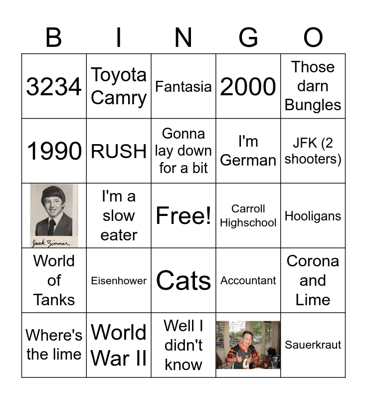 This bingo card has 5 images, a free space and 34 words: Jiminy Nights, Geezy Pete, 1955, RUSH, Where's the lime, Cats, Gonna lay down for a bit, Gin and Tonic, Those darn Bungles, World of Tanks, I'm a slow eater, 2000, Sauerkraut, Hooligans, Carroll Highschool, Eisenhower, Secret Cow Level, 3234, It's a Zimmer thing, Accountant, 1990, Well I didn't know, I'm German, JFK (2 shooters), D*mmit Dan, Barney, 501, 1974, Toyota Camry, Old Man, Fantasia, World War II, Disney World and Corona and Lime.
