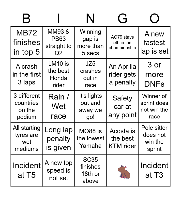 This bingo card has 1 images, a free space and 24 words: Long lap penalty is given, SC35 finishes 18th or above, JZ5 crashes out in race, Incident at T5, A new fastest lap is set, MB72 finishes in top 5, A crash in the first 3 laps, MM93 & PB63 straight to Q2, Safety car at any point, MO88 is the lowest Yamaha, An Aprilia rider gets a penalty, 3 different countries on the podium, Acosta is the best KTM rider, Pole sitter does not win the sprint, LM10 is the best Honda rider, "passionate Argentinian fans", Winner of sprint does not win the race, Winning gap is more than 5 secs, 3 or more DNFs, Rain / Wet race, Incident at T3, A new top speed is not set, All starting tyres are wet mediums and AO79 stays 5th in the championship.