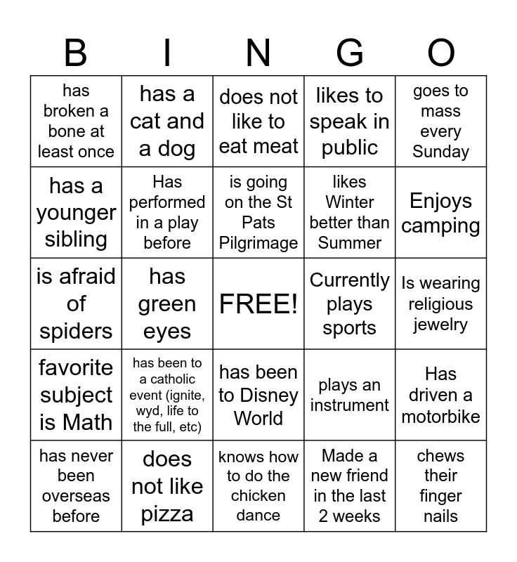 This bingo card has a free space and 24 words: has been to a catholic event (ignite, wyd, life to the full, etc), does not like pizza, is going on the St Pats Pilgrimage, has never been overseas before, goes to mass every Sunday, has broken a bone at least once, has a younger sibling, has a cat and a dog, Currently plays sports, has been to Disney World, likes Winter better than Summer, is afraid of spiders, plays an instrument, Has driven a motorbike, Has performed in a play before, Made a new friend in the last 2 weeks, Is wearing religious jewelry, does not like to eat meat, Enjoys camping, has green eyes, chews their finger nails, favorite subject is Math, likes to speak in public and knows how to do the chicken dance.