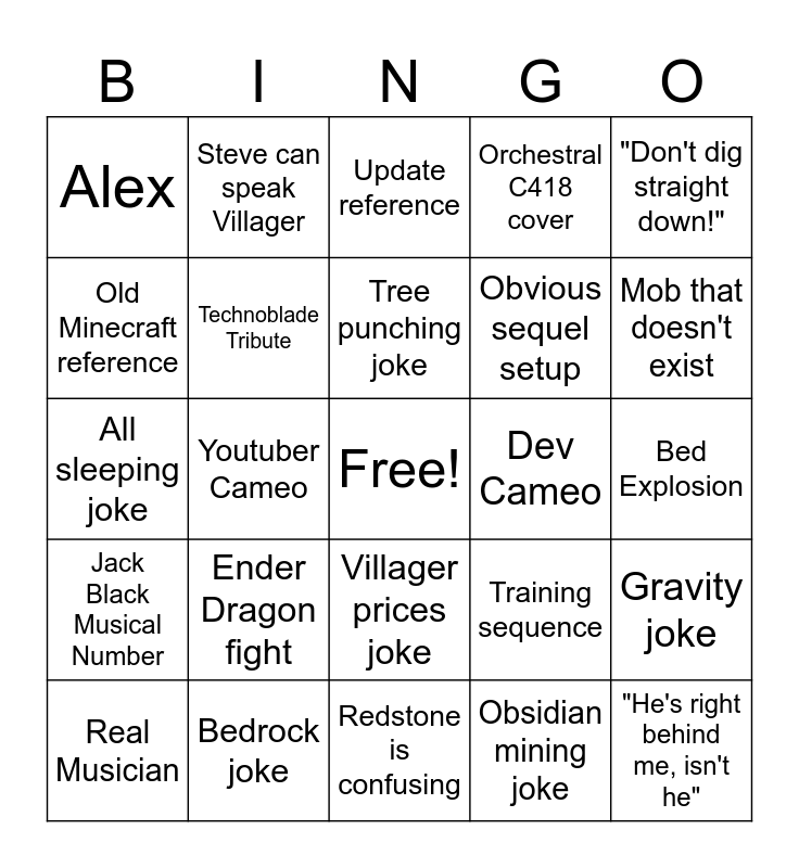 This bingo card has a free space and 39 words: Someone looks at an Enderman, Elytra breaking, "You guys might wanna take a look at this", Technoblade Tribute, Real Musician, Villager prices joke, Tree punching joke, Desert Temple blows up, "Don't dig straight down!", Jack Black Musical Number, Youtuber Cameo, Orchestral C418 cover, "He's right behind me, isn't he", Bed Explosion, Dev Cameo, Ender Dragon fight, Minecraft IRL B-Plot, Alex, Inventory Size Joke, Training sequence, Old Minecraft reference, Redstone is confusing, Obvious sequel setup, Mob that doesn't exist, "English please", Tragic mob death, Enchanting language joke, Cat scares Creeper, Wither, Steve can speak Villager, Ghast fireball deflection, Respawning /keepinventory joke, Update reference, Bedrock joke, Obsidian mining joke, Other game reference, Gravity joke, All sleeping joke and Cave noises.