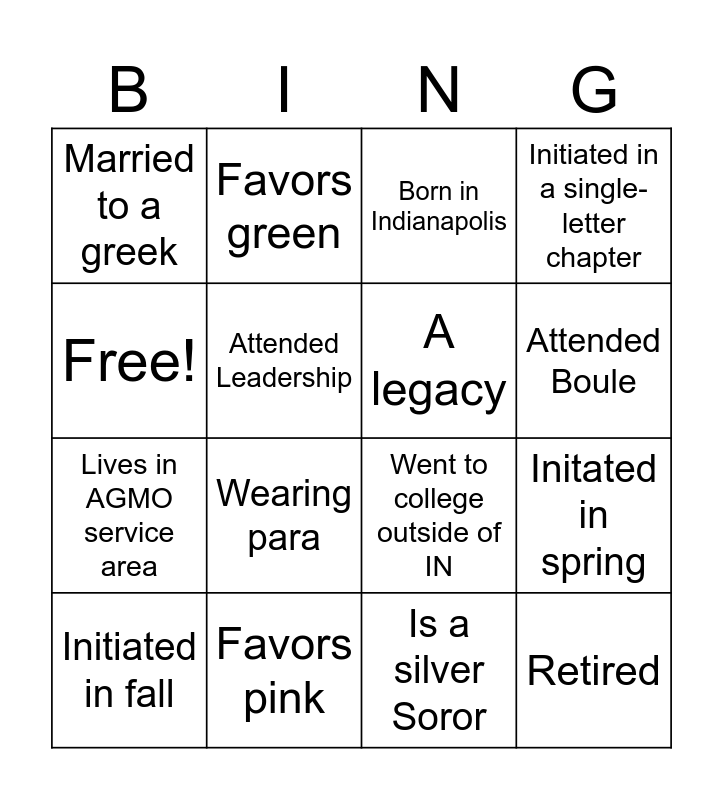 This bingo card has 16 words: Favors pink, Initated in spring, Born in Indianapolis, Married to a greek, Lives in AGMO service area, Favors green, Went to college outside of IN, Is a silver Soror, Free!, Attended Leadership, Initiated in fall, Initiated in a single-letter chapter, Wearing para, Attended Boule, A legacy and Retired.