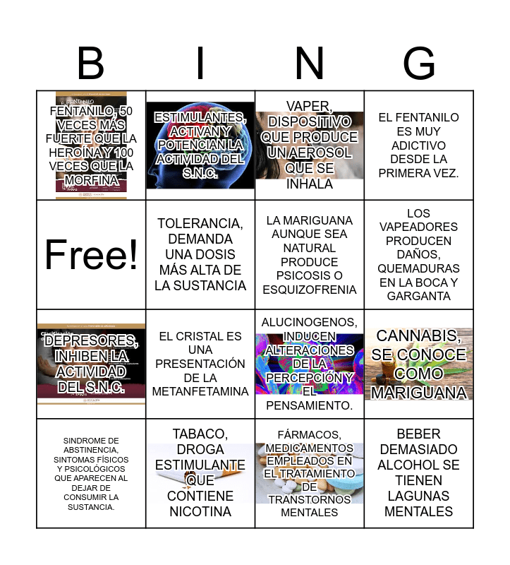 This bingo card has 8 images and 16 words: TABACO, DROGA ESTIMULANTE QUE CONTIENE NICOTINA, CANNABIS, SE CONOCE COMO MARIGUANA, VAPER, DISPOSITIVO QUE PRODUCE UN AEROSOL QUE SE INHALA, FENTANILO, 50 VECES MÁS FUERTE QUE LA HEROÍNA Y 100 VECES QUE LA MORFINA, DEPRESORES, INHIBEN LA ACTIVIDAD DEL S.N.C., ESTIMULANTES, ACTIVAN Y POTENCIAN LA ACTIVIDAD DEL S.N.C., ALUCINOGENOS, INDUCEN ALTERACIONES DE LA PERCEPCIÓN Y EL PENSAMIENTO., FÁRMACOS, MEDICAMENTOS EMPLEADOS EN EL TRATAMIENTO DE TRANSTORNOS MENTALES, Free!, TOLERANCIA, DEMANDA UNA DOSIS MÁS ALTA DE LA SUSTANCIA, SINDROME DE ABSTINENCIA, SINTOMAS FÍSICOS Y PSICOLÓGICOS QUE APARECEN AL DEJAR DE CONSUMIR LA SUSTANCIA., EL FENTANILO ES MUY ADICTIVO DESDE LA PRIMERA VEZ., EL CRISTAL ES UNA PRESENTACIÓN DE LA METANFETAMINA, LOS VAPEADORES PRODUCEN DAÑOS, QUEMADURAS EN LA BOCA Y GARGANTA, LA MARIGUANA AUNQUE SEA NATURAL PRODUCE PSICOSIS O ESQUIZOFRENIA and BEBER DEMASIADO ALCOHOL SE TIENEN LAGUNAS MENTALES.