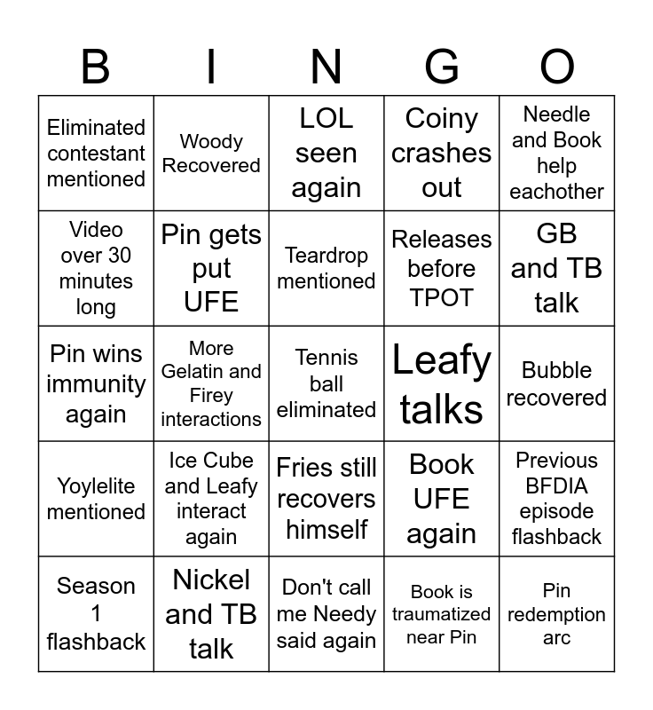 This bingo card has a free space and 24 words: Ice Cube and Leafy interact again, Nickel and TB talk, Teardrop mentioned, Season 1 flashback, Needle and Book help eachother, Eliminated contestant mentioned, Video over 30 minutes long, Woody Recovered, Leafy talks, Fries still recovers himself, Releases before TPOT, Pin wins immunity again, Book UFE again, Previous BFDIA episode flashback, Pin gets put UFE, Book is traumatized near Pin, Bubble recovered, LOL seen again, GB and TB talk, More Gelatin and Firey interactions, Pin redemption arc, Yoylelite mentioned, Coiny crashes out and Don't call me Needy said again.