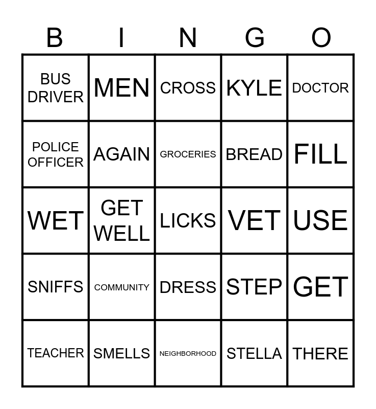 This bingo card has 25 words: COMMUNITY, NEIGHBORHOOD, GROCERIES, TEACHER, DOCTOR, BUS DRIVER, POLICE OFFICER, MEN, VET, DRESS, BREAD, WET, STEP, GET, AGAIN, THERE, USE, CROSS, FILL, GET WELL, LICKS, SMELLS, SNIFFS, KYLE and STELLA.
