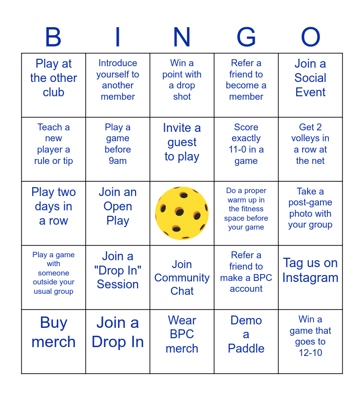 This bingo card has a free space and 26 words: Join Community Chat, Demo a Paddle, Invite a guest to play, Join a Drop In, Join a Social Event, Play at the other club, Teach a new player a rule or tip, Introduce yourself to another member, Take a post-game photo with your group, Refer a friend to make a BPC account, Score exactly 11-0 in a game, Play two days in a row, Tag us on Instagram, Buy merch, Join an Open Play, Take a lesson or a Play with the Pro, Refer a friend to become a member, Play a game with someone outside your usual group, Win a point with a drop shot, Win a game that goes to 12-10, Get 2 volleys in a row at the net, Wear BPC merch, Do a proper warm up in the fitness space before your game, Join a "Drop In" Session, Play a game before 9am and Win a rally with a lob shot.