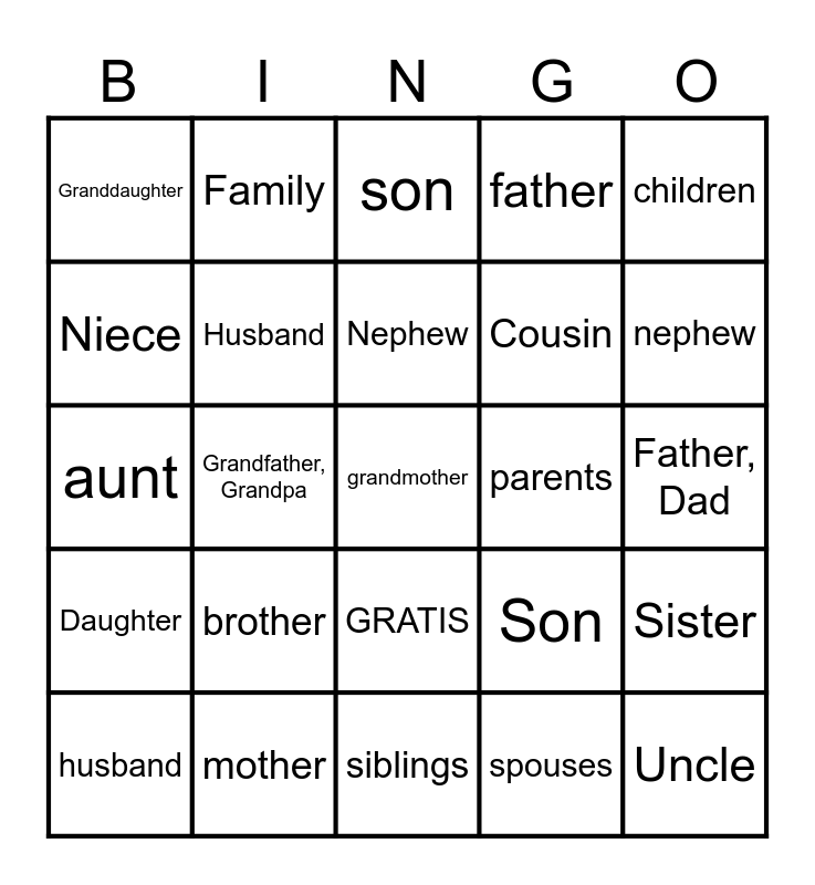This bingo card has 43 words: grandfather, grandmother, grandparents, husband, wife, spouses, son, daughter, children, mother, father, parents, GRATIS, brother, sister, siblings, niece, aunt, uncle, nephew, Family, Parent-in-law, Great-grandmother, Granddaughter, Grandson, Father, Dad, Mother, Mom, Parents, Son, Daughter, Brother, Sister, Grandmother, Grandma, Grandfather, Grandpa, Grandchild, Grandson, Granddaughter, Aunt, Uncle, Nephew, Niece, Cousin, Brother/Sister-in-lawe, Husband and wife.