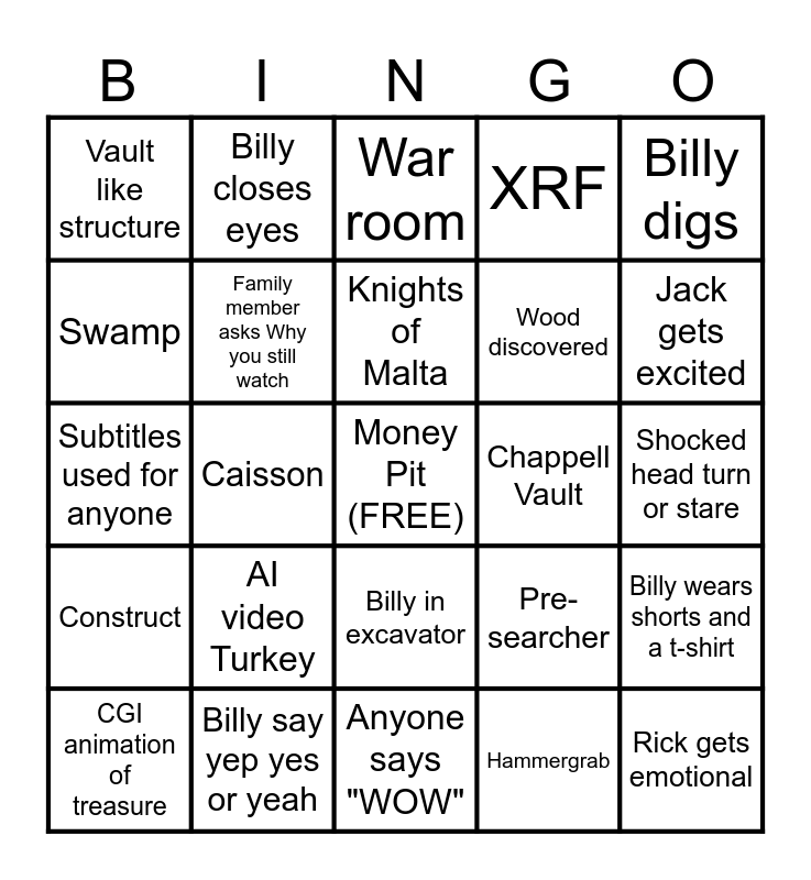 This bingo card has a free space and 24 words: AI video Turkey, Billy say yep yes or yeah, Knights of Malta, CGI animation of treasure, Billy digs, Vault like structure, Swamp, Billy closes eyes, Chappell Vault, Billy in excavator, Wood discovered, Subtitles used for anyone, Pre-searcher, Billy wears shorts and a t-shirt, Family member asks Why you still watch, Hammergrab, Shocked head turn or stare, War room, Jack gets excited, Caisson, Rick gets emotional, Construct, XRF and Anyone says "WOW".
